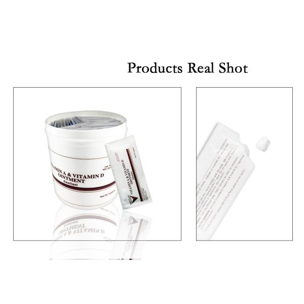 | Product Details : 1. Ointment is rich in essential vitamins A and D. Reduce the risk of scabbing. No itching. Extremely important for faster tattoo healing. 2. Vitamin A & D ointment leaves skin soft and smooth. It can be used to relieve and soothe a new tattoo. Can also be used to re-moisturise old/existing tattoos. 3. Vacuum packaging. Clean the affected area. | Item name | Tattoo Vitamin A-D Ointment Foil | | Packing | 50pcs/jar | | Net | 5 g/pcs | | Feature | broad-spectrum recovery, better effect | | Directions | Cleanse affected area with mild soap and warm water, dry thoroughly. Apply Vitamin A plus Vitamin D ointment in a thin layer to the affected area directly to the skin or by spreading on sterile gauze or clean cloth. Bandage loosely. To open, reverse cap to puncture seal. | | Inactive Ingredients | Vaseline, Borneol, Peppermint, Vitamin, Acyclovir, Tropine, Penicillin, Dexamethasone, Stauntonvine |  Function: - anti-scab, anti-scar, restore, anti- hypersusceptibility, smooth, diminish inflammation, detumescence, promote metabolism,kill pain