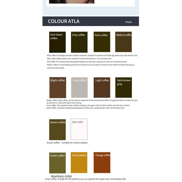 Color classification : Black, black coffee, dark coffee, medium coffee, bright coffee, gray coffee, light coffee, dark brown gray, brown coffee, orange coffee (change blue eyebrow), green coffee (change red eyebrow), skin color, natural yellow